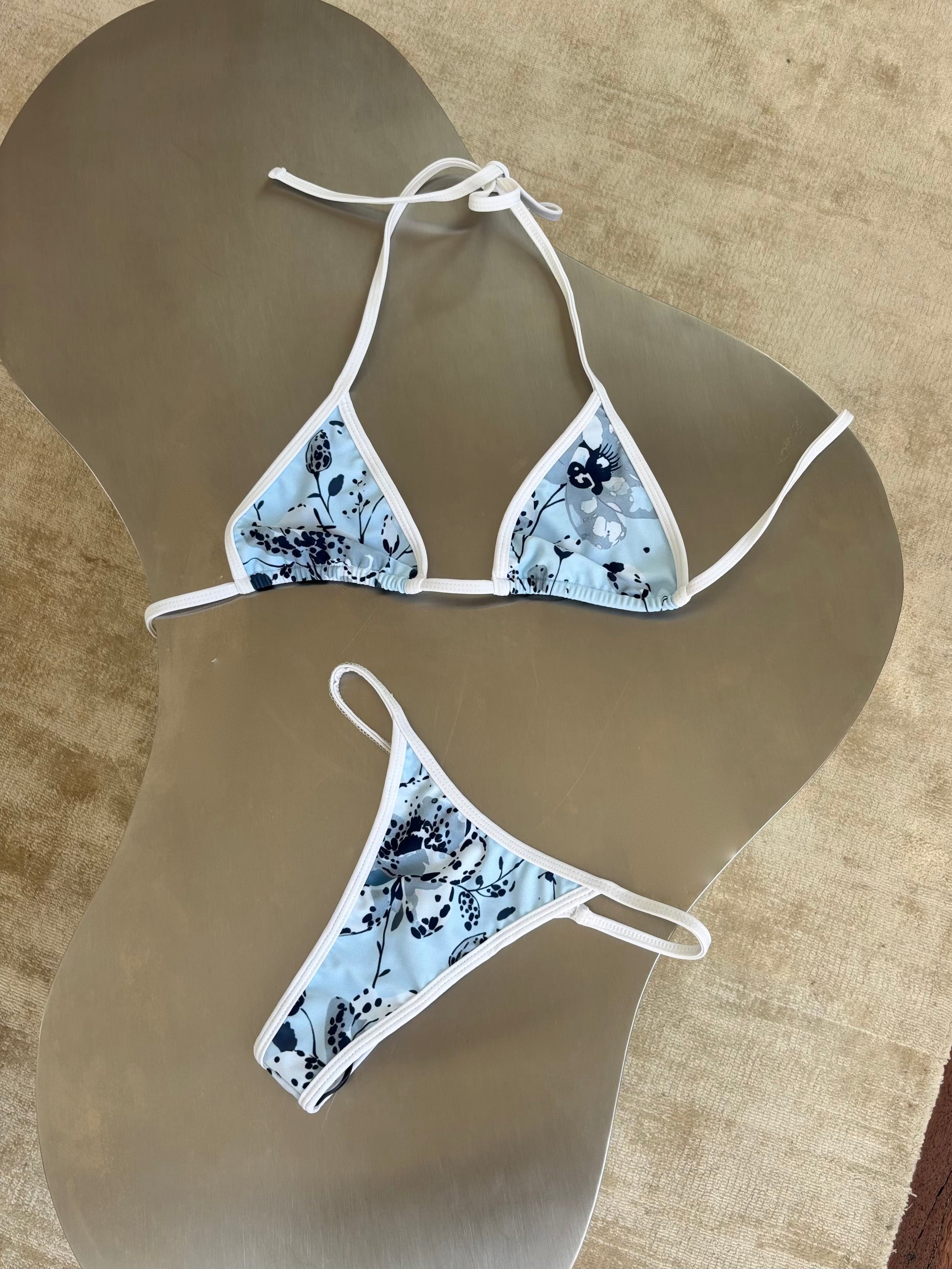 The Amélie Top is a classic triangle silhouette, elevated through thoughtful details and a soft vintage inspired print. Designed with a flattering narrow triangle cut and contrast ivory binding, it sits delicately on the body while offering an adjustable, personalised fit.